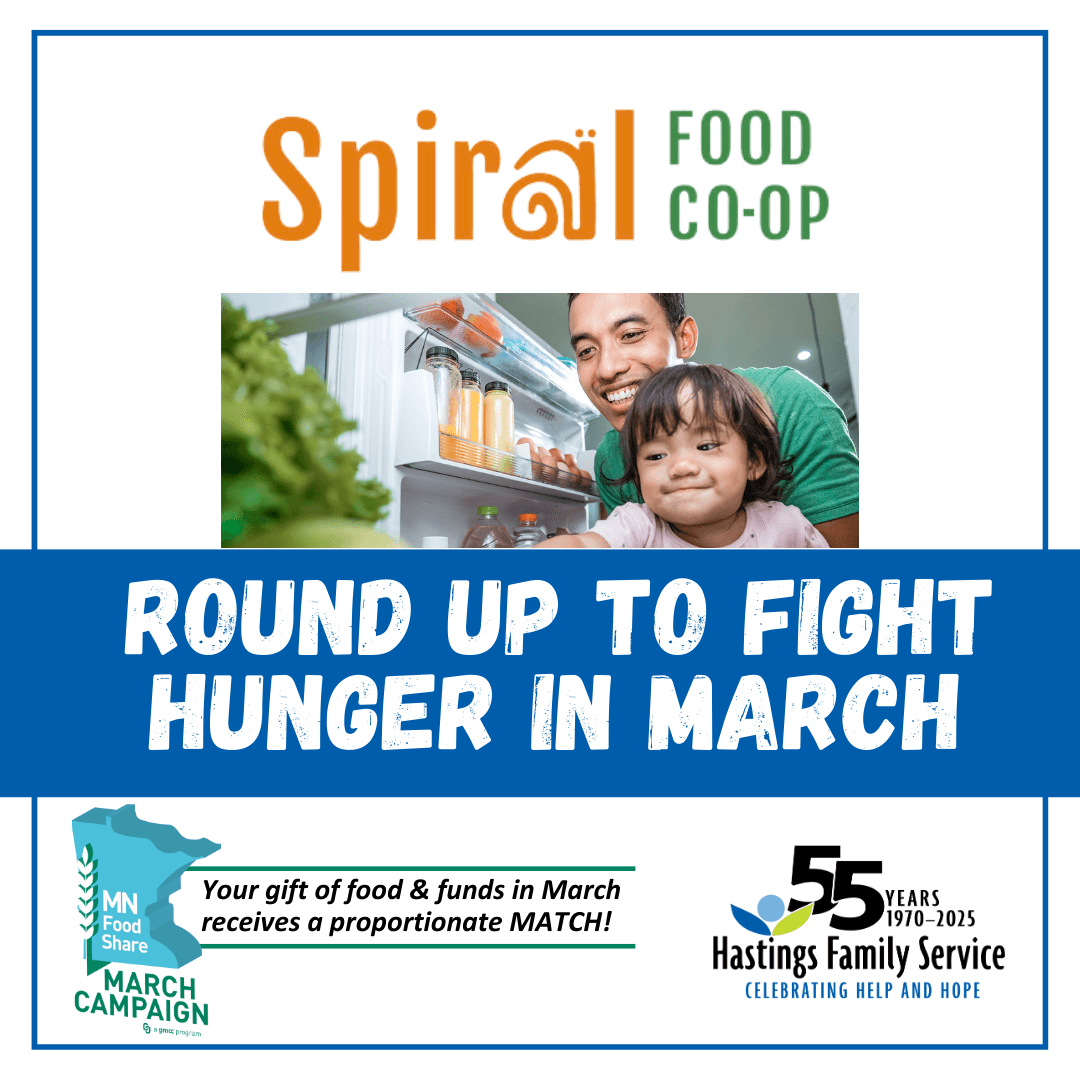 Thank you to our friends at Spiral Foods Co-Op for helping to fight hunger! Visit their amazing store and round up at the register in March, with all gifts making a greater impact through a proportionate MATCH during the Minnesota FoodShare March Campaign. Thank you for sharing help and hope!